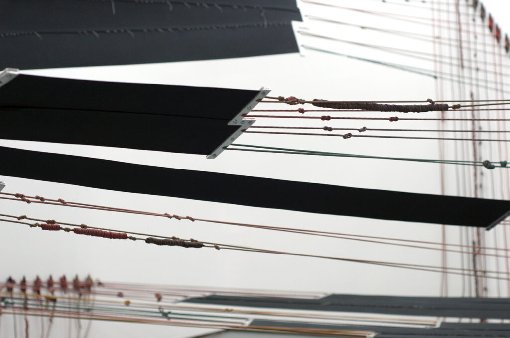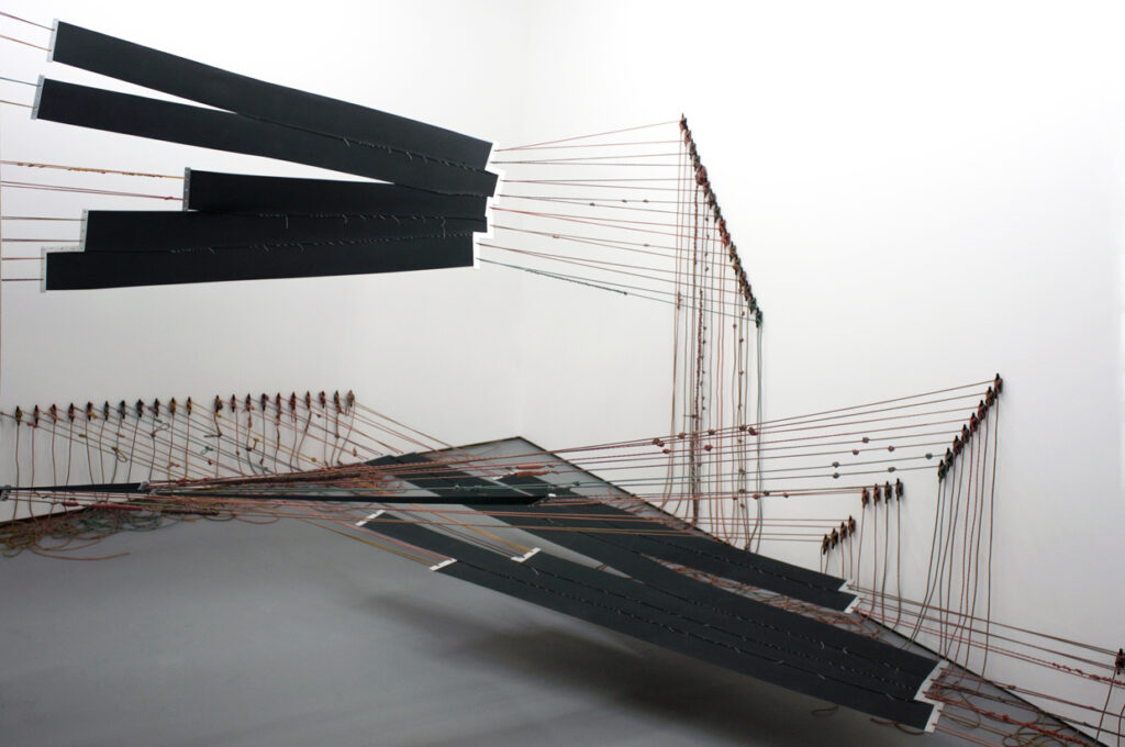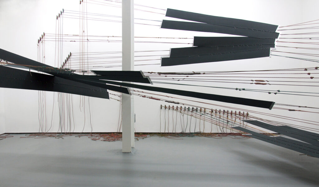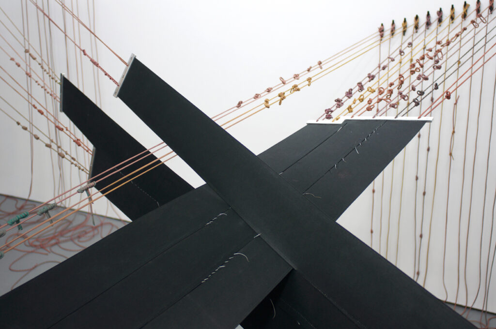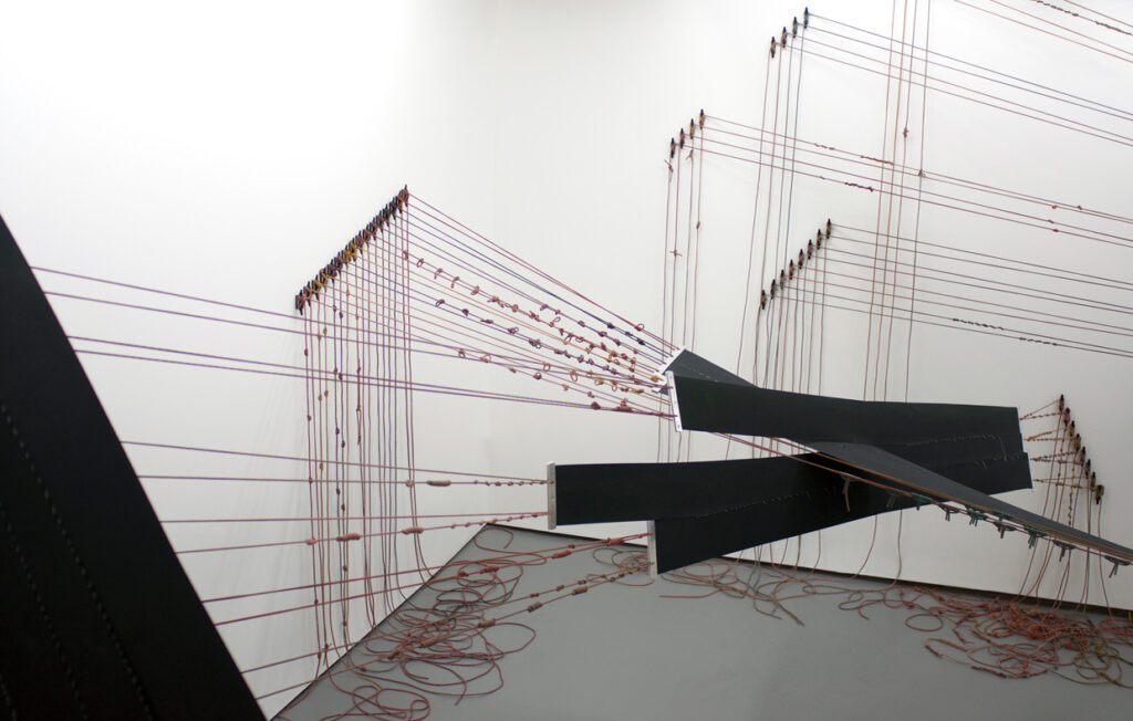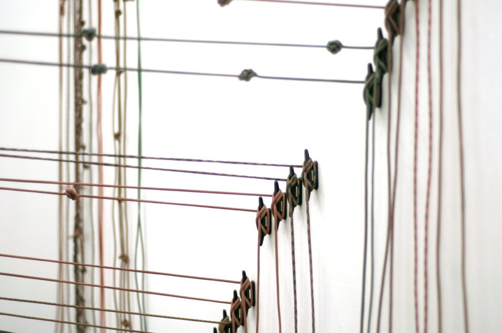 In Absentia Luci, 2017 // Elastic, aluminum, dyed paracord, plastic anchors // Dimensions variable // 4th Ward Project Space, Chicago, Ill.