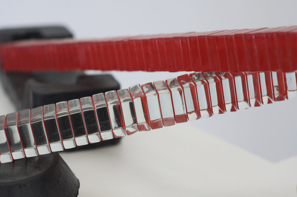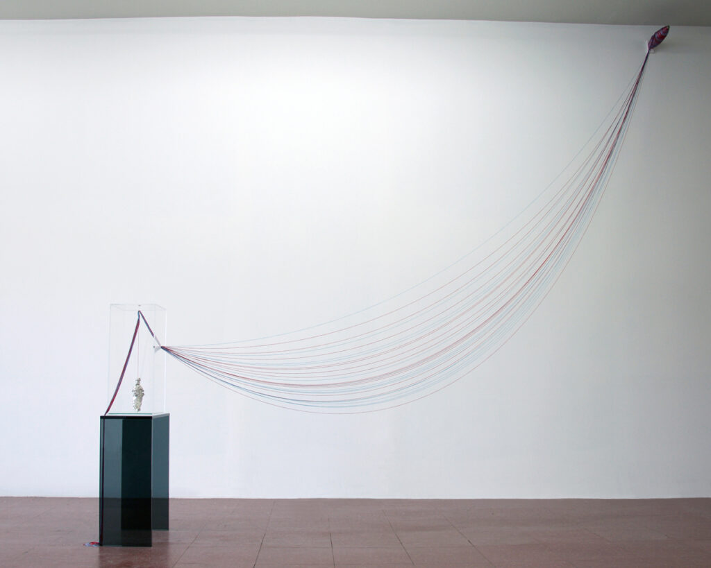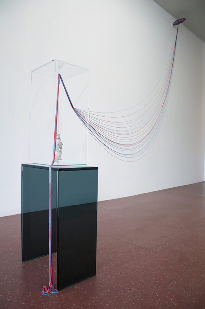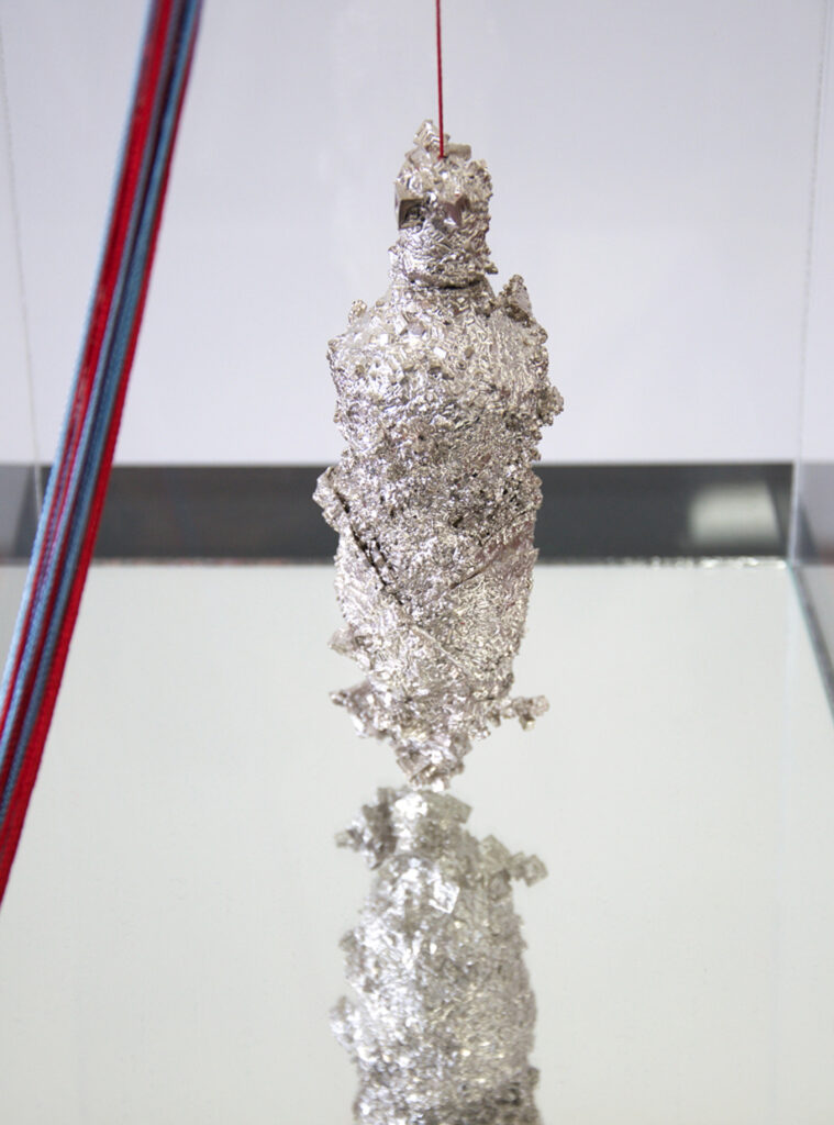 There Is No Fixed Place, 2017 // brass, bismuth, acrylic, glass, polyester yarn, foam, plaster, steel // 15 x 9 x 42″ with variable elements